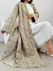 عباية قماش جاكار بتصميم أنيق يجمع بين الطول الكامل والقصة المفتوحة من الأمام، مع حزام رفيع يبرز الخصر وأكمام واسعة تضيف لمسة راقية تناسب الإطلالات الرسمية والسهرات.