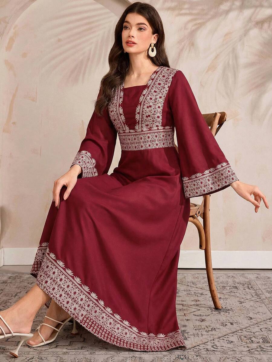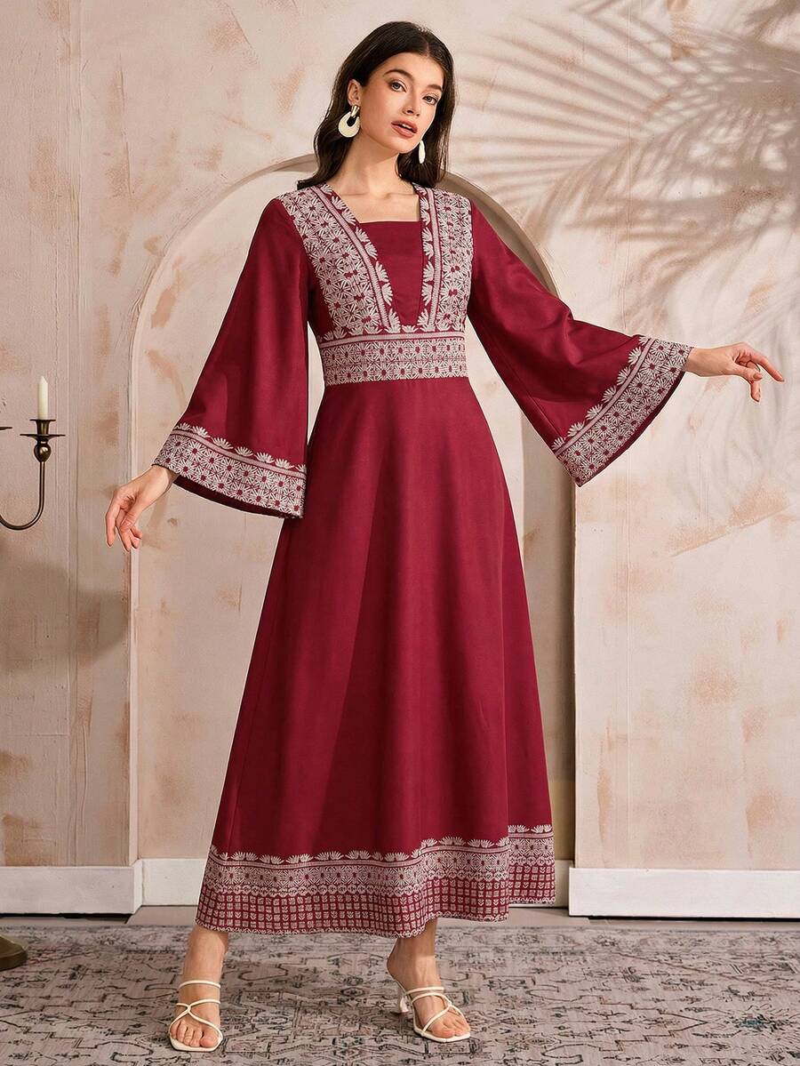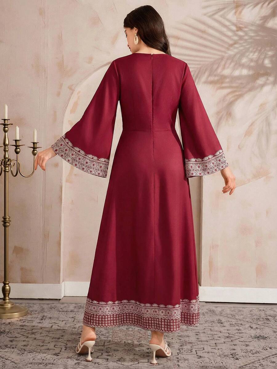 فستان طويل أنيق مطبوع بأكمام متفرعة
