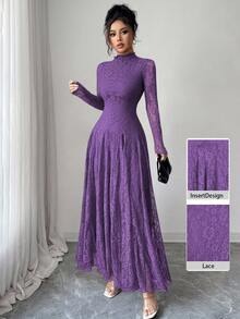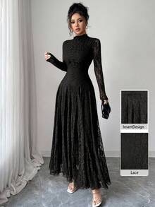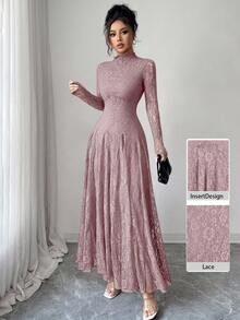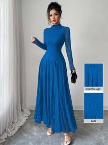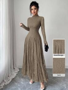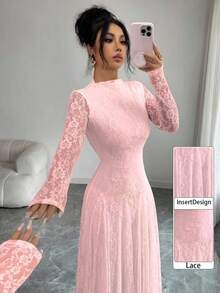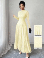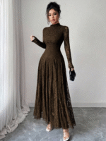 فساتين دانتيل طويله بتصميم أنيق بياقة عالية وأكمام طويلة، مع قصة ضيقة من الأعلى تتسع تدريجيًا نحو الأسفل (A-line)، ليمنحك إطلالة متناسقة وفاخرة تصل إلى الكاحل، مثالي للسهرات والمناسبات الرسمية.